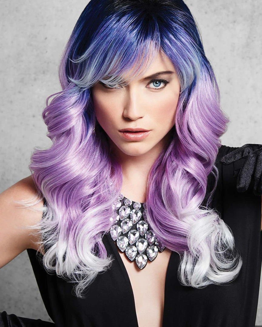 Melt hearts in this cool toned color combo. Long rooted waves boldly go from midnight blue to purple that fades into white lilac. The Tru2Life Heat-friendly synthetic fiber can be styled into a different curl pattern or completely straight. With a comfortable cap design you can wear it for a night out or even all day. Arctic Melt gives you #hairgoals…….no celebrity colorist or harsh chemicals required.