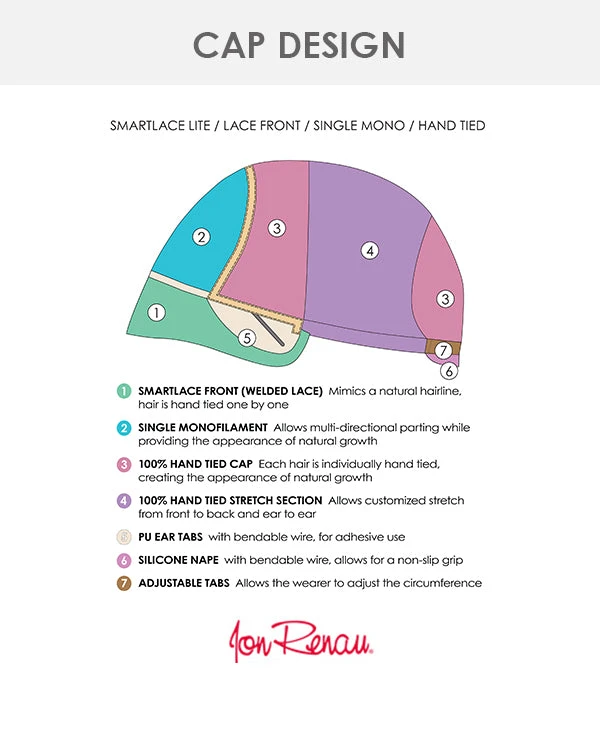 One of Jon Renau’s most popular bobs gets an upgrade with the new SmartLace™ Lite cap. With lighter hair density and a unique lace front that extends from ear to ear for the most realistic hairline, Cameron Lite is a timeless style with elegant layers and refined length. Her mono top and 100% hand-tied cap provide the appearance of natural hair growth.