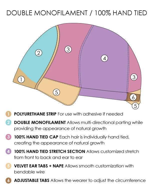 Elegant sideswept bangs and cascading long layers exude chic allure. The hand tied mono top allows for versatile styling in any direction — let your imagination reign!