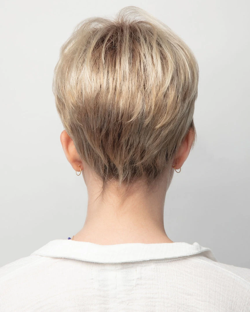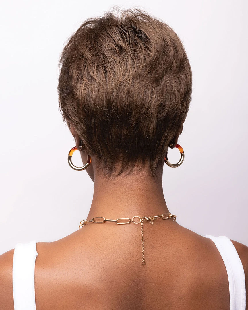 Lace Front pixie cut with side swept bangs and tapered nape.