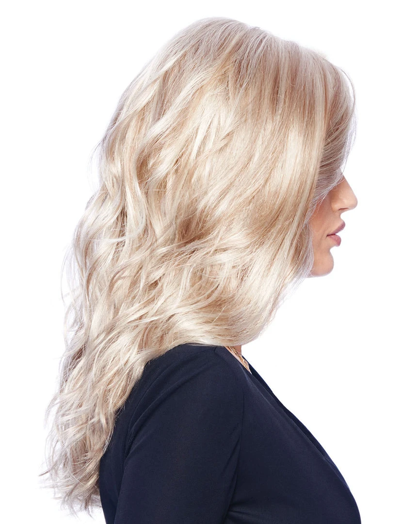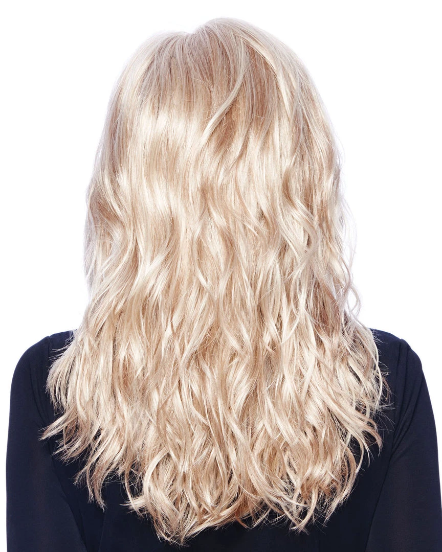 One of our longest layered shapes, this silhouette is loaded with tumbled, cascading waves that offer just the right amount of fullness to deliver a natural look and appeal. This style can be “scrunched” up for more texture, or brushed out to create a glamorous and soft wave. The Sheer Indulgence™ lace front monofilament top allows for natural looking off-the-face styling and parting options.