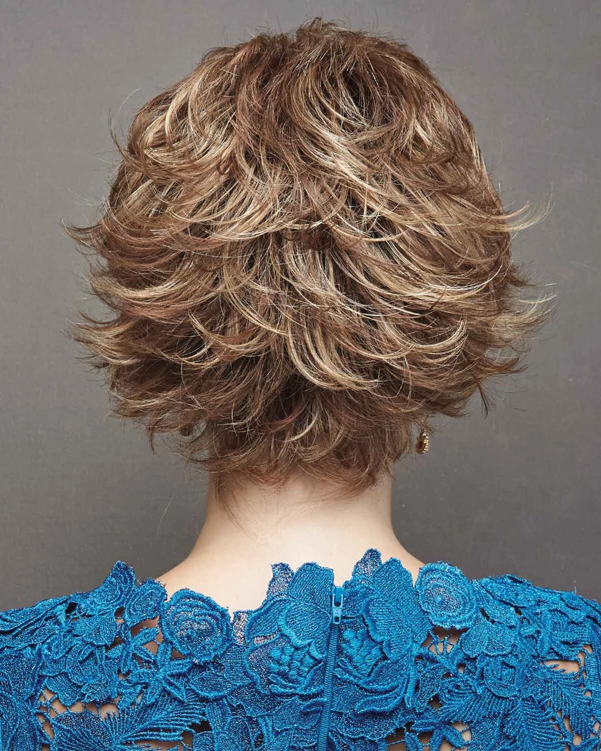 Mixed layers with beveled ends build attitude into this style with a sophisticated “kick”.
