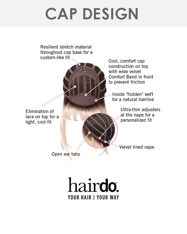 The perfect shade of peachy pink can now be yours without commitment. This pastel color trend is paired with a bob cut, making it classic yet edgy. The multi-faceted color has a darker root to add contrast and a natural look. Have your hairstylist customize the bang and style the Tru2Life heat-friendly synthetic hair with a curling iron or flat iron. The cap is made to be light and as cool as you.