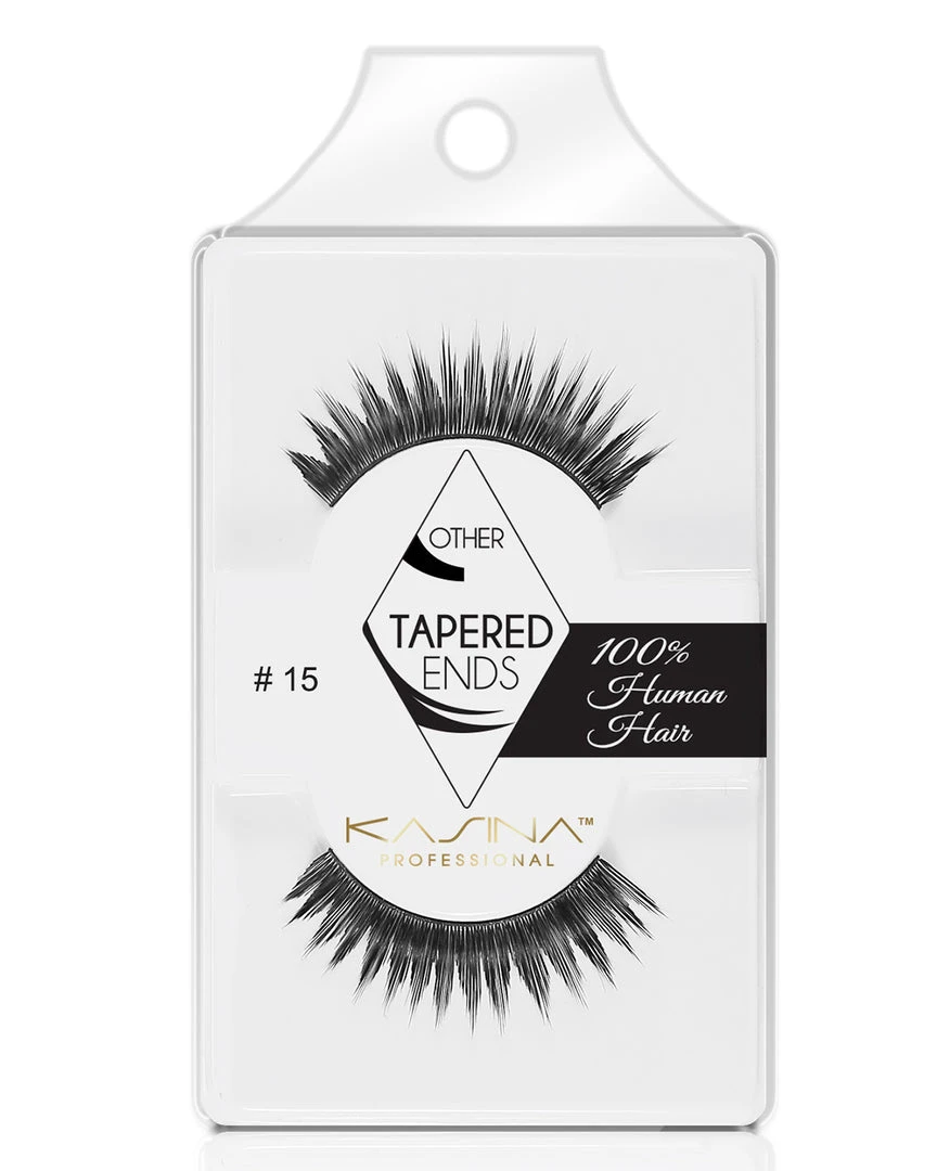 KASINA Professional #15 Tapered ends false eyelashes are subtle in length and moderately full black false eyelashes. KASINA 15 are black dramatic fake eyelashes with densely bundled spiky lash for a eye opening look. This elegant, hand-worked eyelashes have slender, long, separated black lashes for a fabulously photo ready effect.