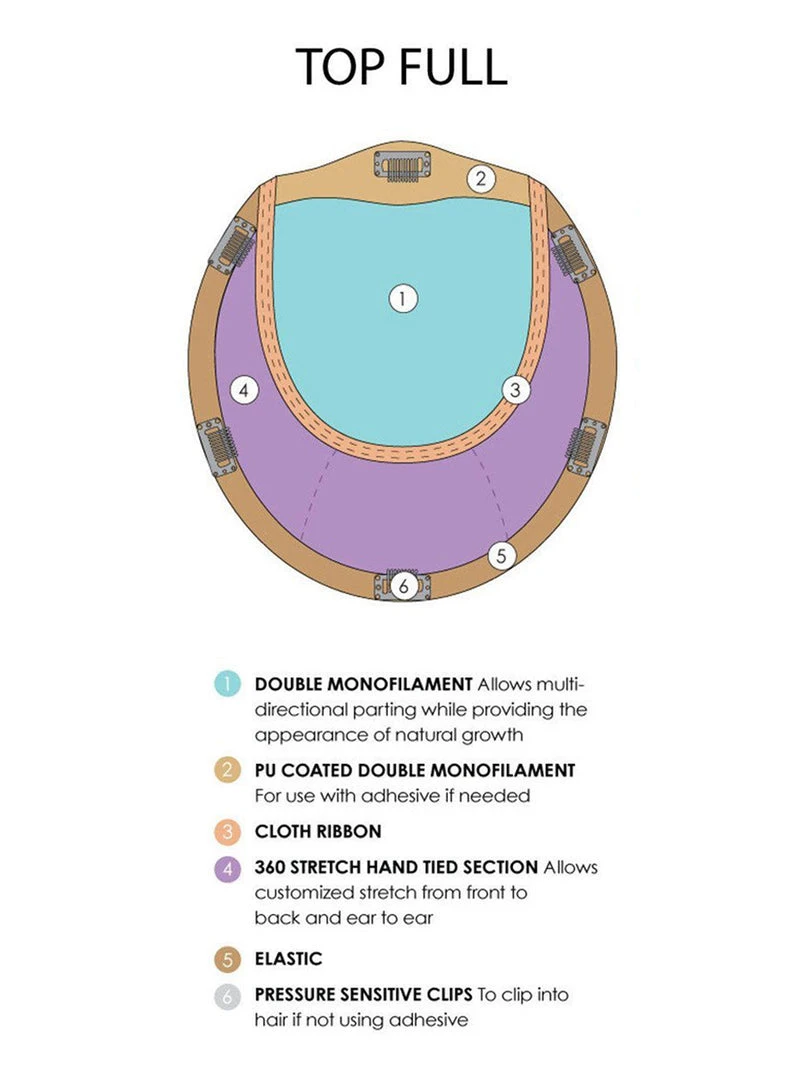 Designed with the comfort of a 100% hand tied stretch base, this long Remy human hair volumizer is worn over the entire crown, providing the most coverage of any clip in topper.