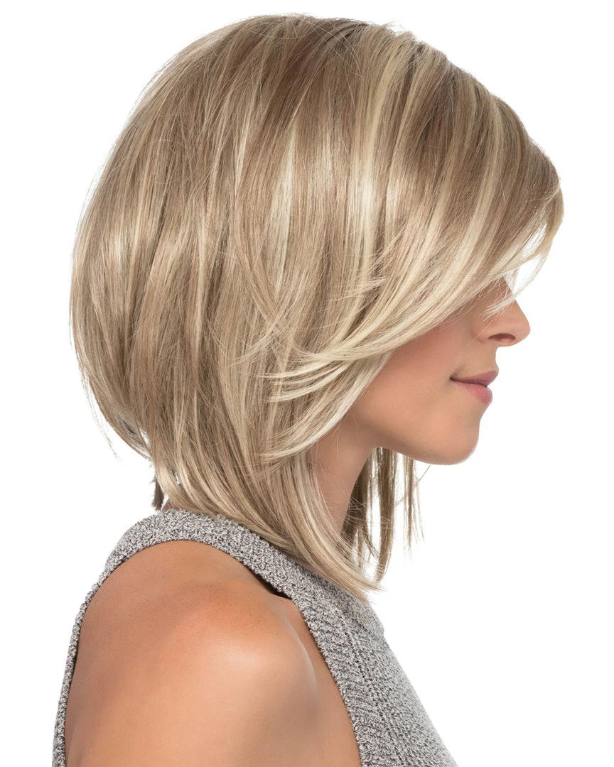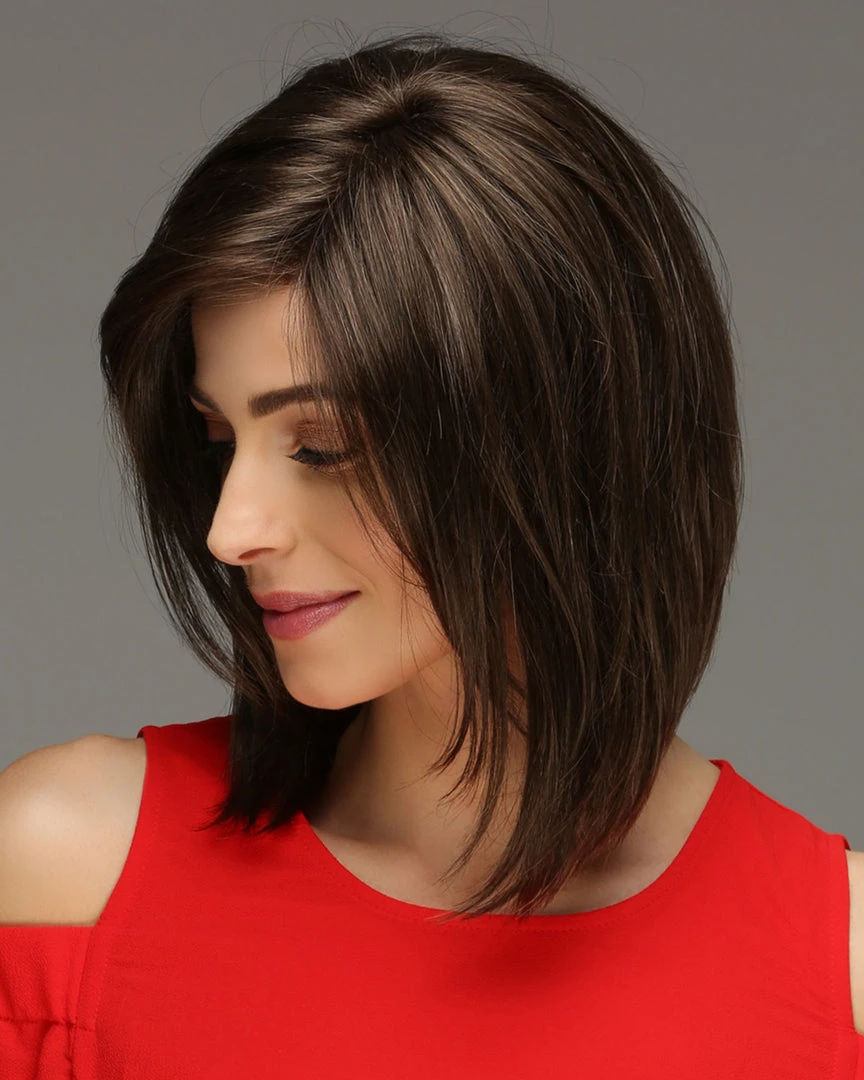 Sky’s not a traditional lob. This look is both sexy and chic; the perfect amount of versatility all in one style. Her slightly angled layers and flowing side bangs make this shoulder length style simple and sleek for a perfect evening.