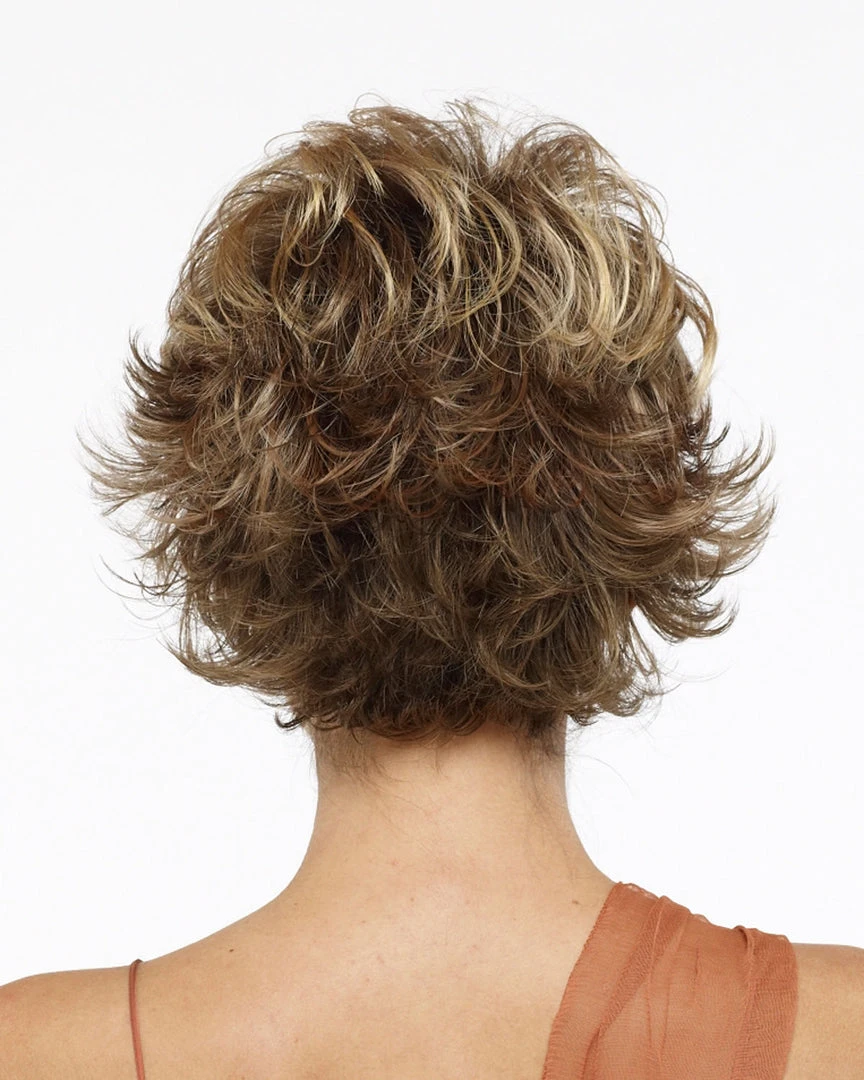Tapered neckline and swirling waves of soft curls offer a completely wearable style.